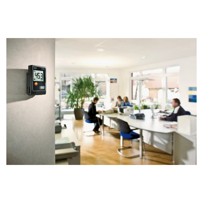 The Testo 174H Set is a compact 2-channel temperature and humidity data logger that ensures reliable monitoring of indoor environments, storage areas, archives, and climate-sensitive goods. Whether for warehouses, museums, offices, or residential buildings, this versatile mini data logger accurately records temperature, humidity, and dew point to help you maintain optimal environmental conditions.